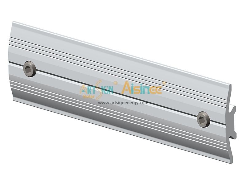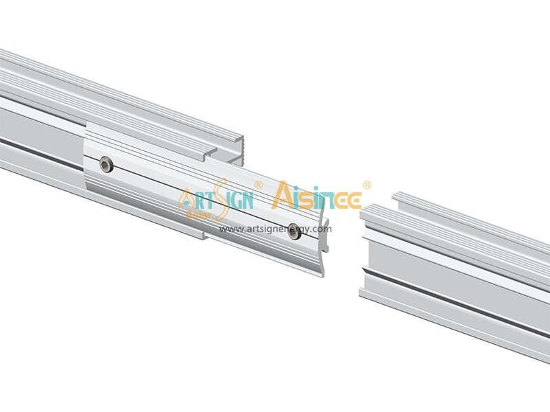 Fixe a emenda de trilho AS-RS-09 inserindo-a nos perfis de alumínio e apertando os parafusos de cabeça chata M8. Este método de fixação interna garante uma conexão nivelada e de alta resistência na junção do trilho solar.